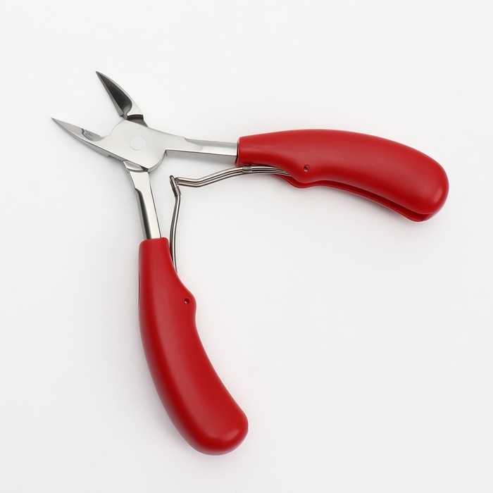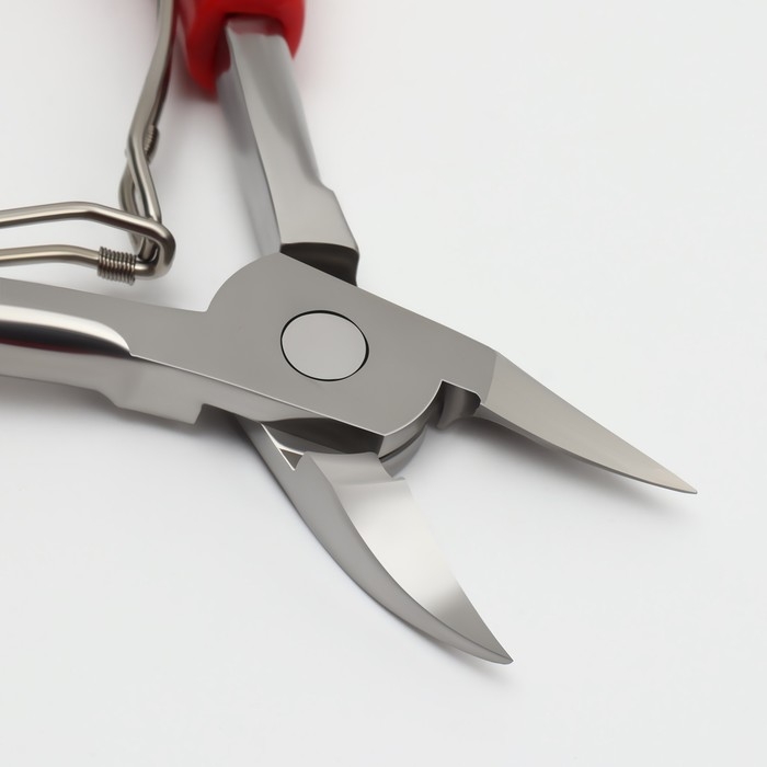 Кусачки педикюрные со скрытой пружиной, с пластиковой ручкой, изогнутое лезвие, 13 см, длина лезвия - 17 мм, цвет серебристый/красный