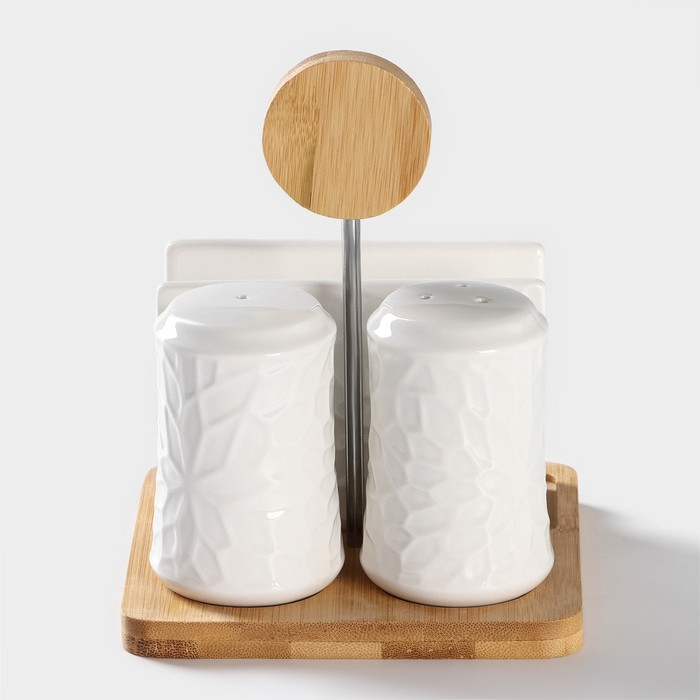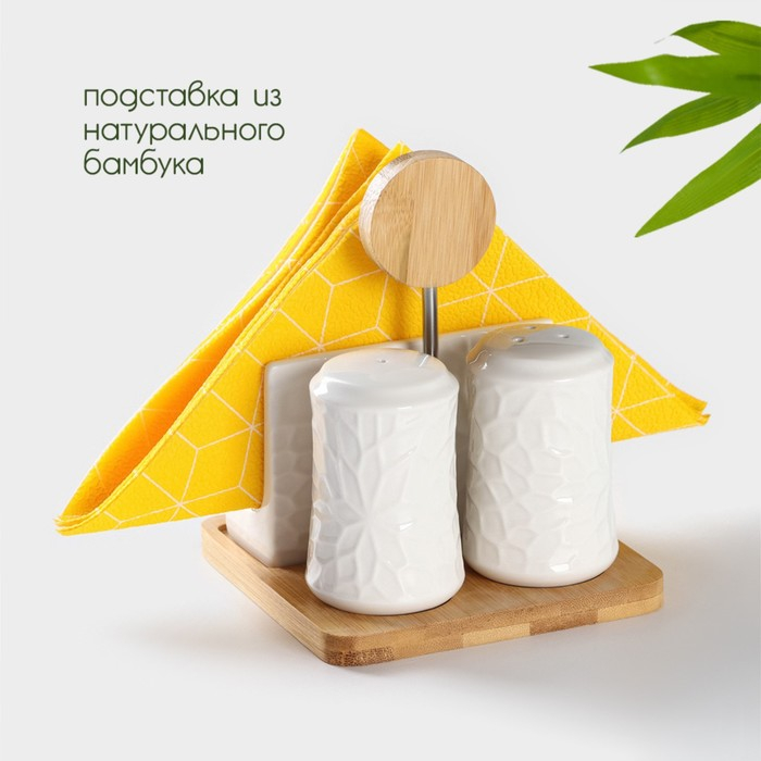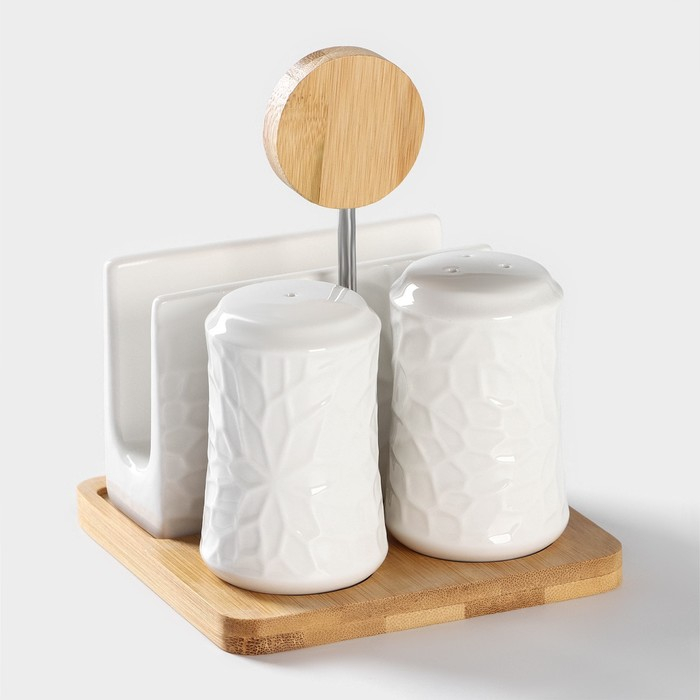 Набор для специй на деревянной подставке BellaTenero, 4 предмета: солонка 75 мл, перечница 75 мл, салфетница, ёмкость для зубочисток, цвет белый