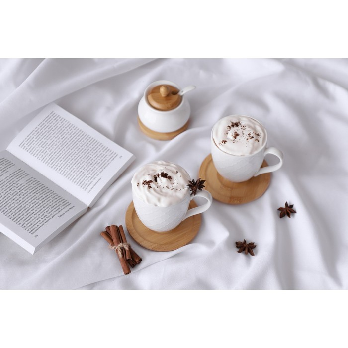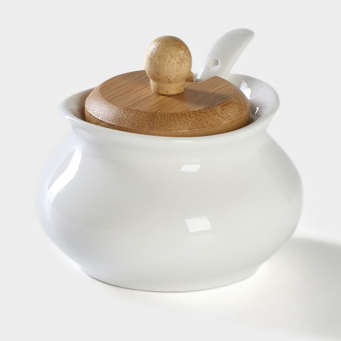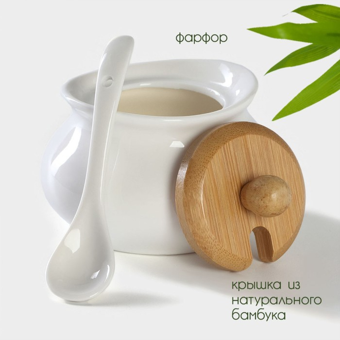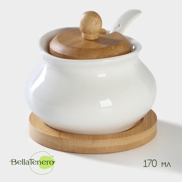 Сахарница фарфоровая с ложкой на деревянной подставке BellaTenero, 170 мл, цвет белый