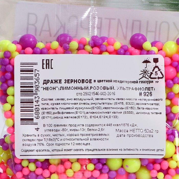 Кондитерская посыпка с эффектом неона в цветной глазури "Лимонный, розовый, ультрафиолет", 50 г