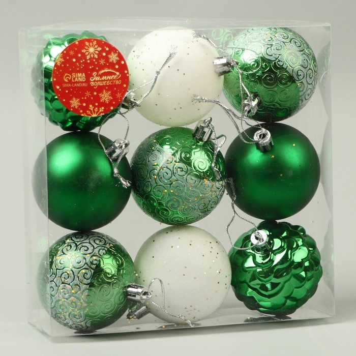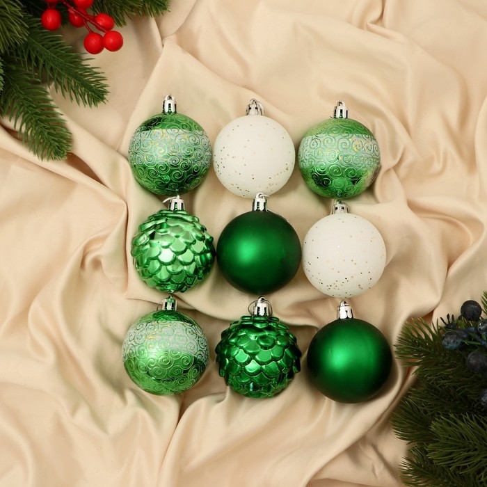 Набор шаров пластик d-5,5 см, 9 шт "Гармония" шишки завитки, зелёный белый
