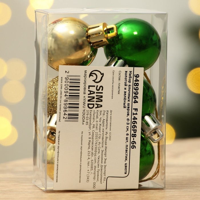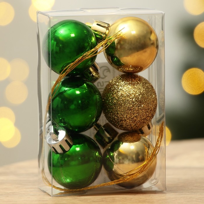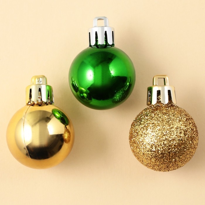 Шары ёлочные новогодние, на Новый год, пластик, d=3 см, 6 шт., цвет золотой и зелёный