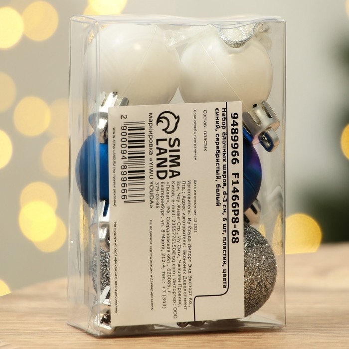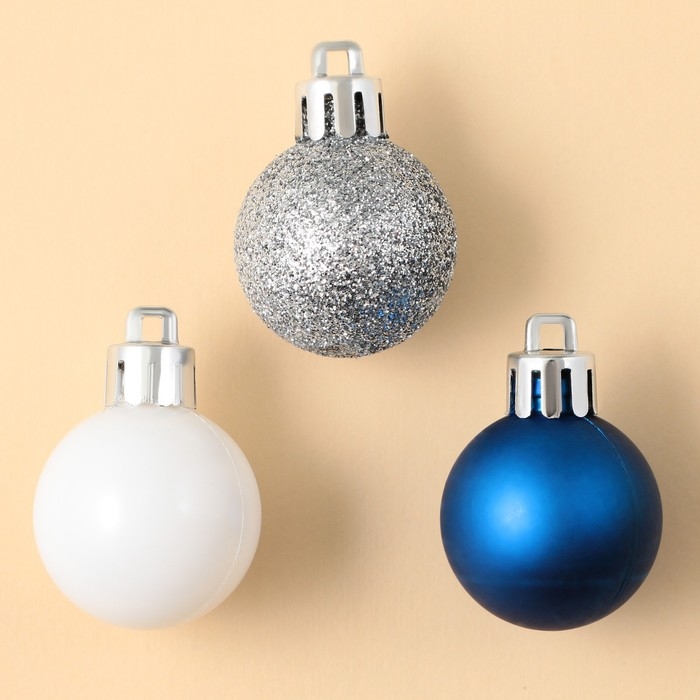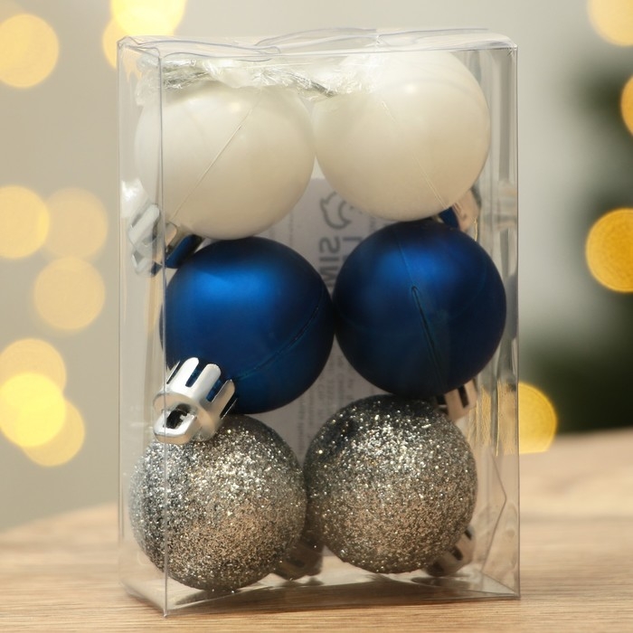 Шары ёлочные новогодние, на Новый год, пластик, d=3 см, 6 шт., цвет синий, серебристый, белый