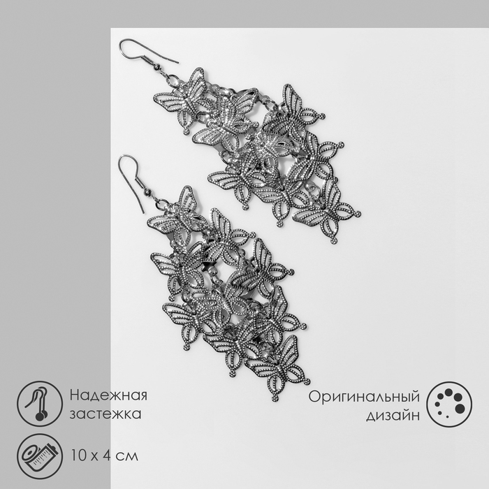 Серьги висячие «Бабочки» рой, цвет серебро,10 см