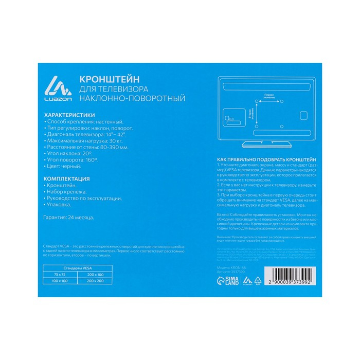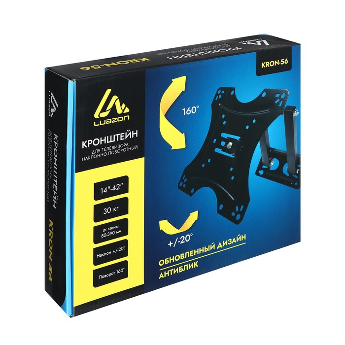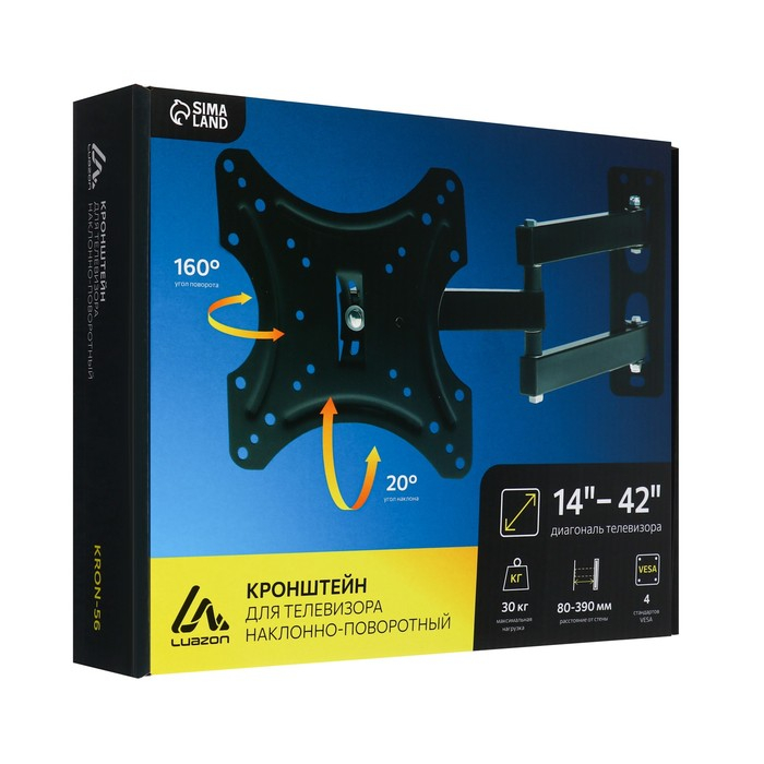 Кронштейн Luazon KrON-56, для ТВ, наклонно-поворотный, 14-42", 80-390 мм от стены, чёрный