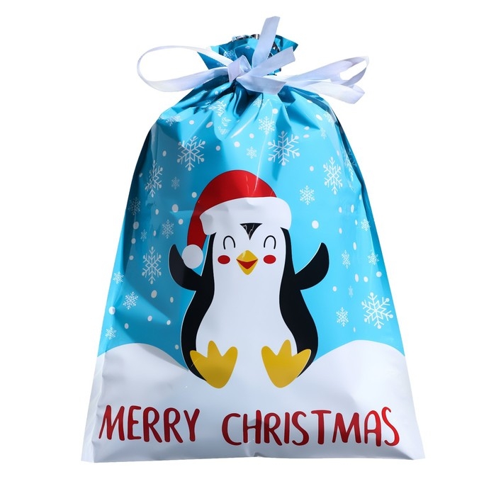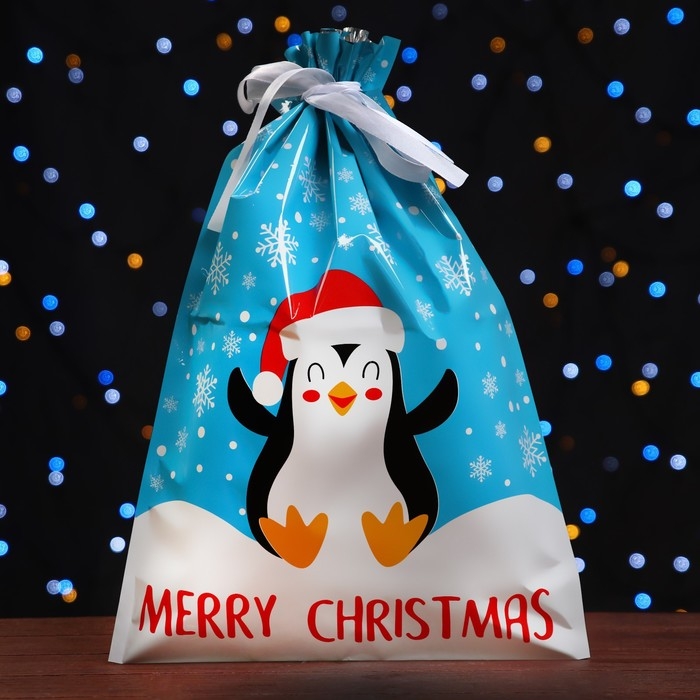 Новый год. Пакет подарочный с завязками, "Счастливый пингвин", 29х43 см.