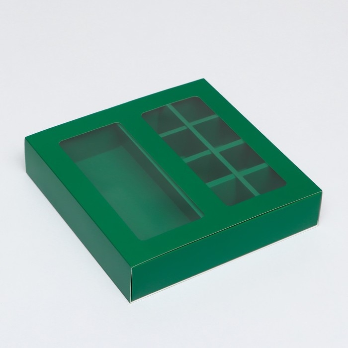 Коробка для 8 конфет + шоколад, с окном зеленая 17,7 х 17,85 х 3,85 см. Кондитерская упаковка