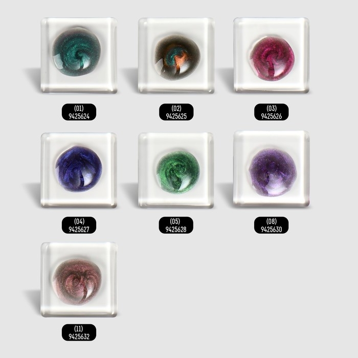 Магнитный гель лак кошачий глаз — это глубокий объемный блик, который под разным углом зрения меняет свой первоначальный цвет от двух до пяти переливов, а светоотражающие частички будут переливаться на свету.Индикатор цвета на верху бутылька, поможет Вам подобрать идеальный цвет.