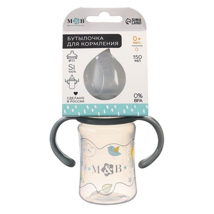 Бутылочка для кормления, широкое горло, с ручками, 150 мл, цвет серый