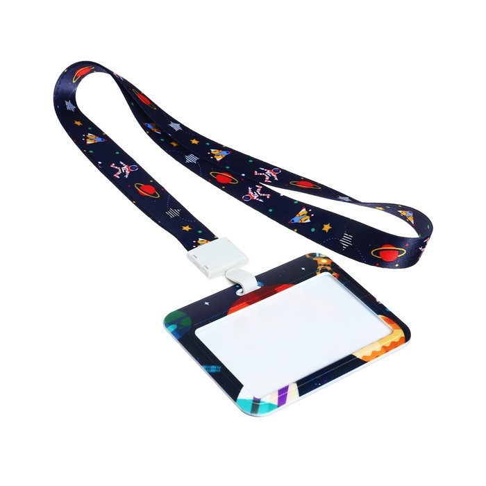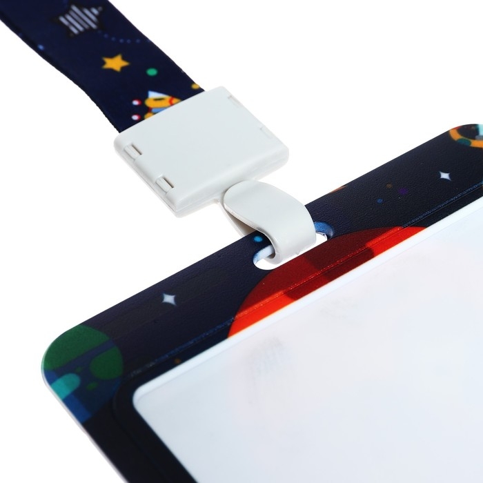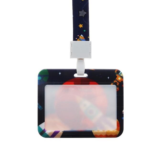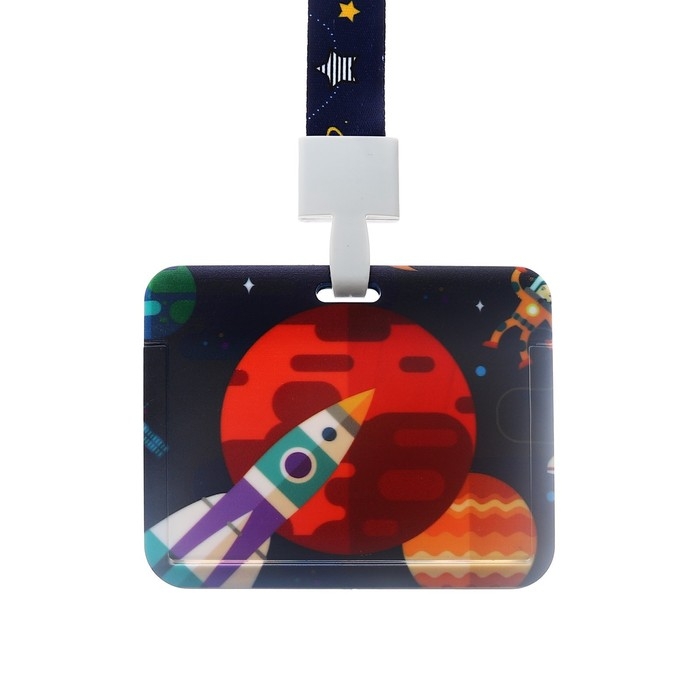 Бейдж горизонтальный внешний размер 10 х 7,8 см, внутренний размер 5,2 х 8,2 см, лента 42 см, с рисунком "Космос"
