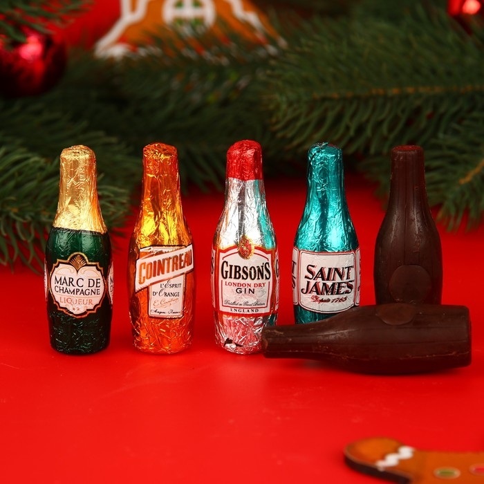 Шоколадные бутылочки из Франции станут отличным и вкусным подарком для ваших родных и близких. Попробуйте фигурки из темного шоколада с ассорти начинок: Marc de Champagne, джин Gibson's, ром St.James, Куантро; вкус которых раскрывается постепенно, где согревающее терпкое ощущение начинки перекликается с насыщенным шоколадным послевкусием.