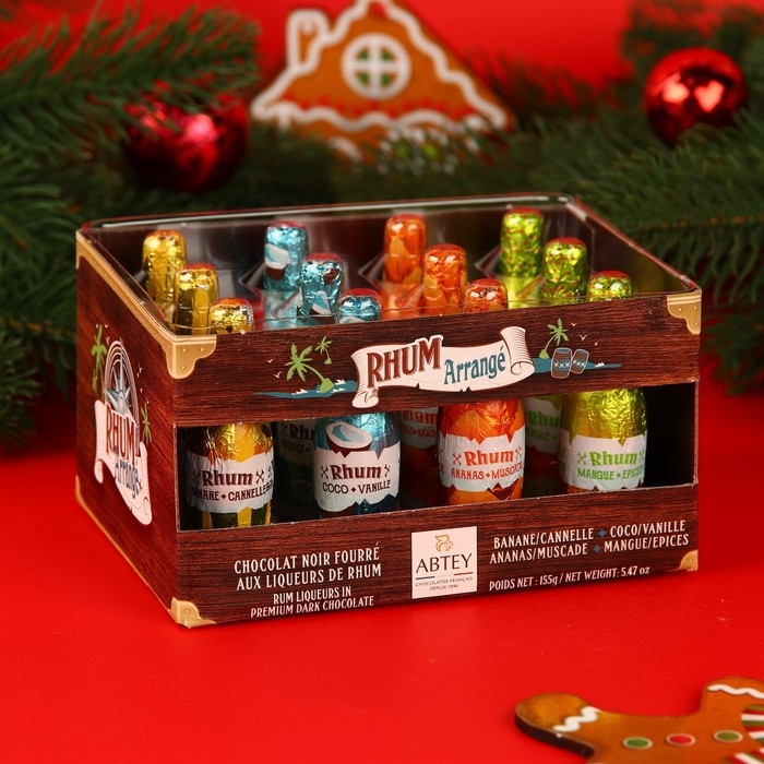 Шоколадные бутылочки из Франции станут отличным и вкусным подарком для ваших родных и близких. Попробуйте фигурки из шоколада с начинкой из рома со вкусами: банан и корица, кокос и ваниль, ананас и мускатный орех, манго и специи; вкус которых раскрывается постепенно, где согревающее терпкое ощущение начинки перекликается с насыщенным шоколадным послевкусием.