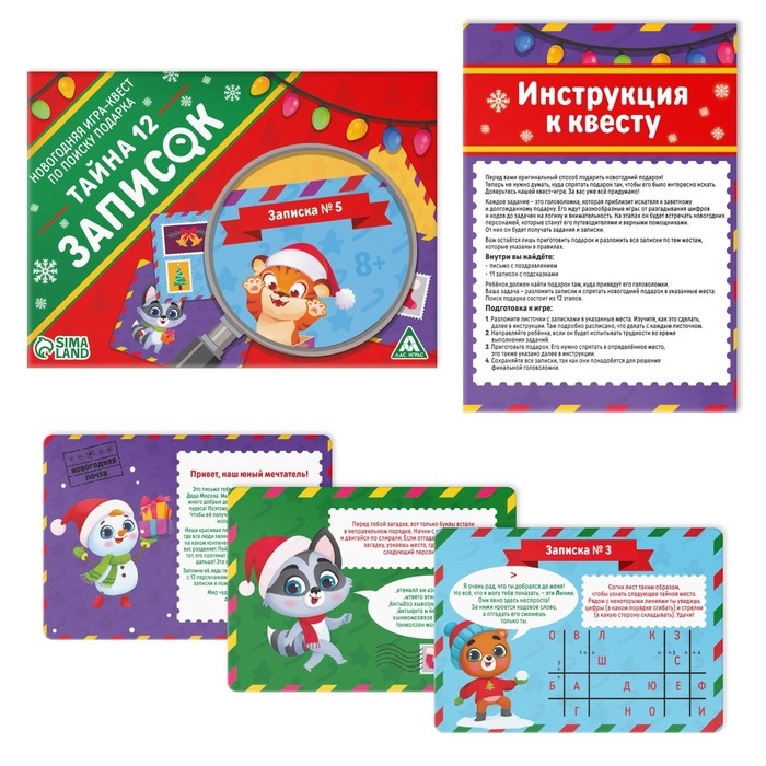 Новогодняя настольная игра-квест по поиску подарка «Новый год: Тайна 12 записок», 11 подсказок, письмо, 8+