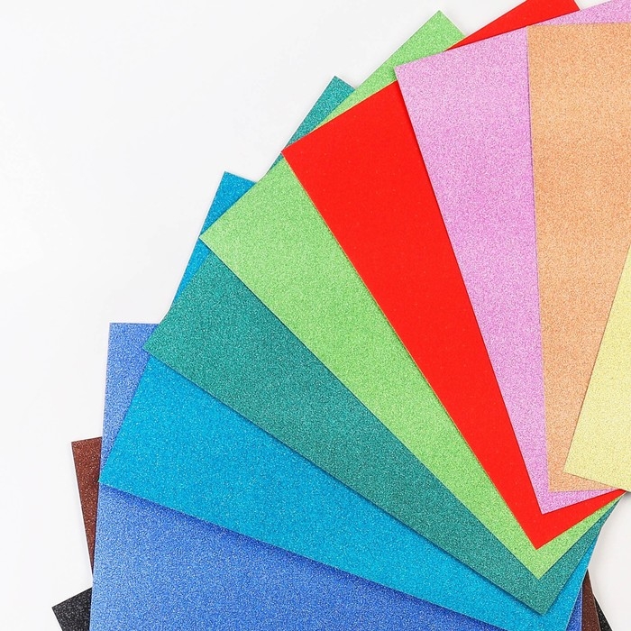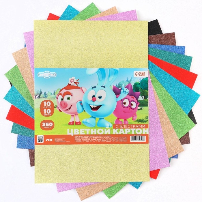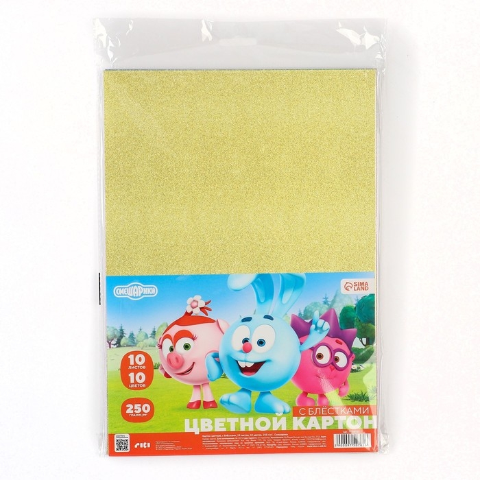 Картон цветной с блёстками, А4, 10 листов, 10 цветов, немелованный, односторонний, в пакете, 250 г/м², Смешарики
