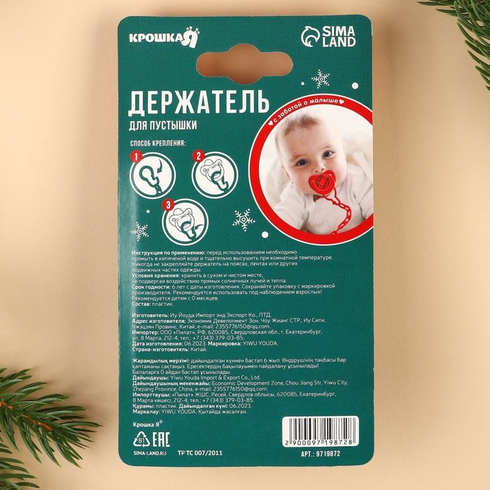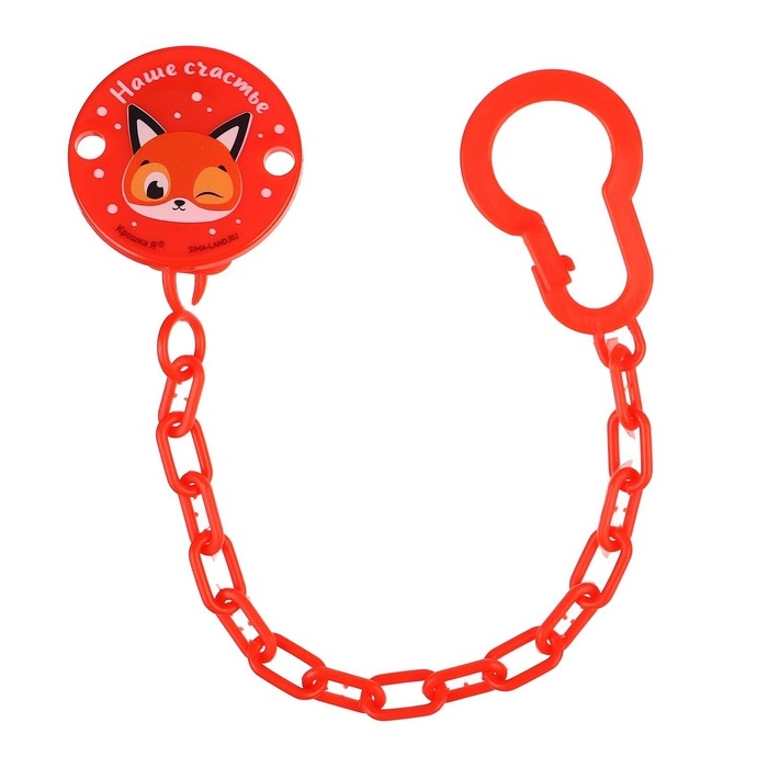 Изделие фиксируется на одежде ребёнка. На конце цепочки есть карабин, который зацепляется за кольцо пустышки. Надёжное крепление убережёт вещь от падения на пол, если малютка случайно выронит её изо рта.