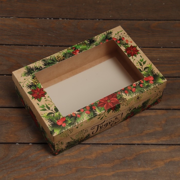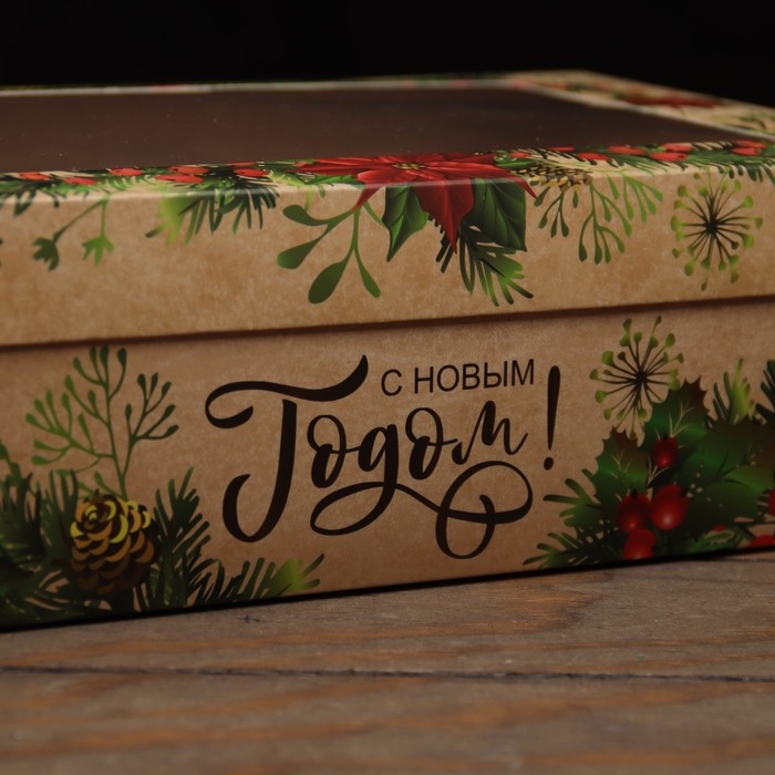 Новый год. Коробка подарочная новогодняя складная, крышка-дно , с окном "С Новым Годом и новым счастьем" 30 х 20 х 9 см