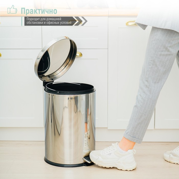 - Удобство использования: педаль для открытия крышки позволяет избежать контакта с поверхностями, что улучшает гигиену.