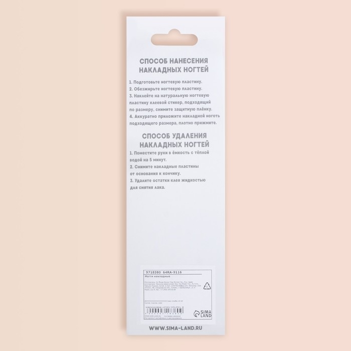 Эти ногти легко крепятся с помощью безопасных клеевых пластин, которые не повреждают натуральные ногти и обеспечивают длительное ношение до 14 дней. В наборе все, что нужно для быстрого и удобного маникюра. Благодаря гипоаллергенному пластику ногти подходят для чувствительной кожи и могут использоваться повторно.