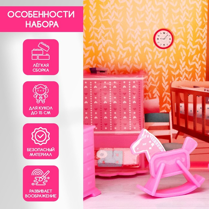 Малышка придёт в восторг от яркого домика. Стильная мебель, модный интерьер — красочные разнообразные предметы с первых секунд завладеют вниманием девочки.