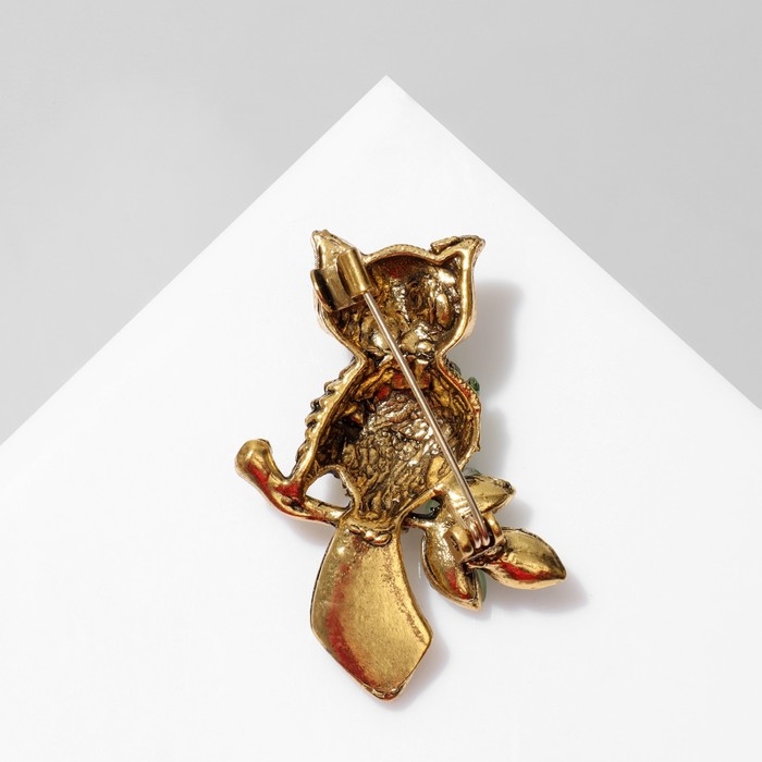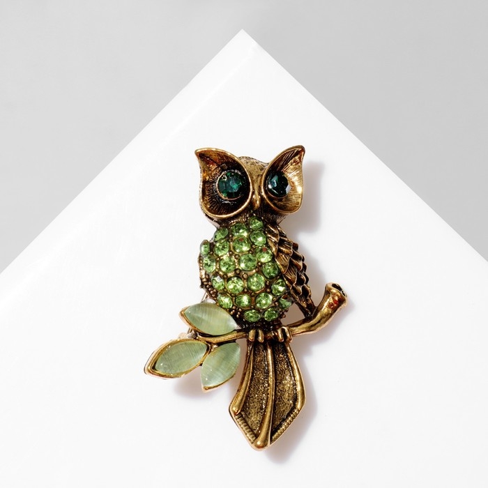 Брошь «Сова на ветке», цвет зелёный в чернёном золоте