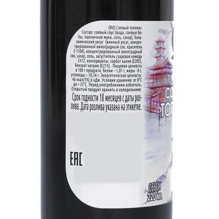 Соевый топпинг ТМ «СП Мирный» - это сочетание соевого соуса и бальзамического уксуса.