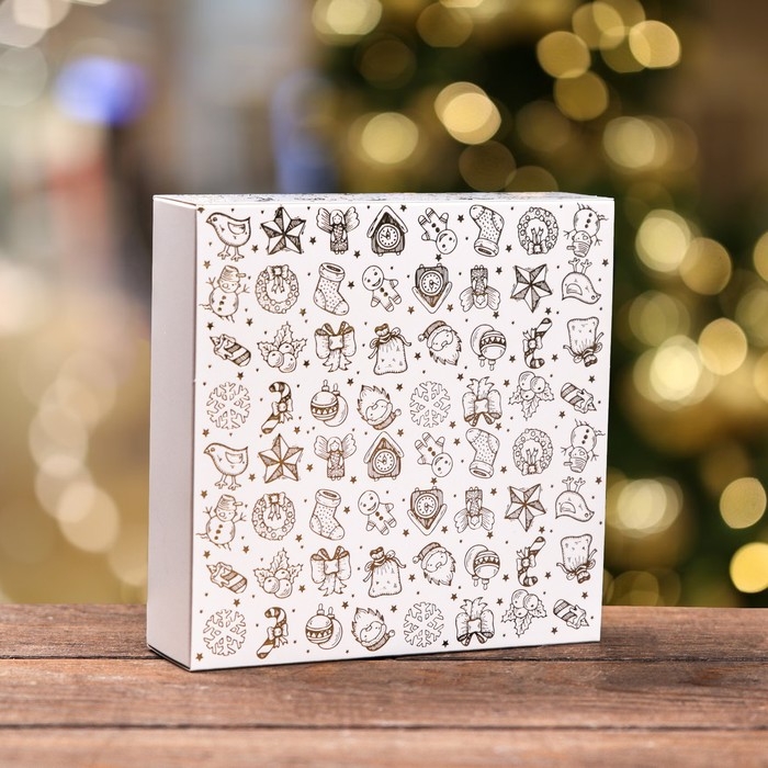 - Эта коробка выполнена в золотом цвете и украшена новогодними мотивами, создавая атмосферу праздника и волшебства.