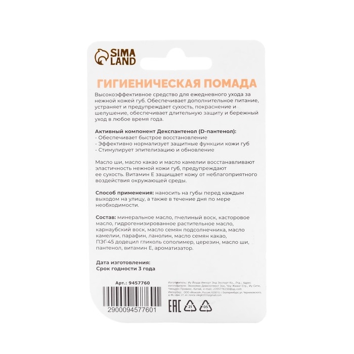 Состав: минеральное масло, пчелиный воск, касторовое масло, гидрогенезированное растительное масло, карнаубский воск, масло семян подсолнечника, масло камелии, парафин, ланолин, масло семян какао, ПЭГ-45 додецил гликоль сополимер, церезин, масло ши, пантенол, витамин Е, ароматизатор.