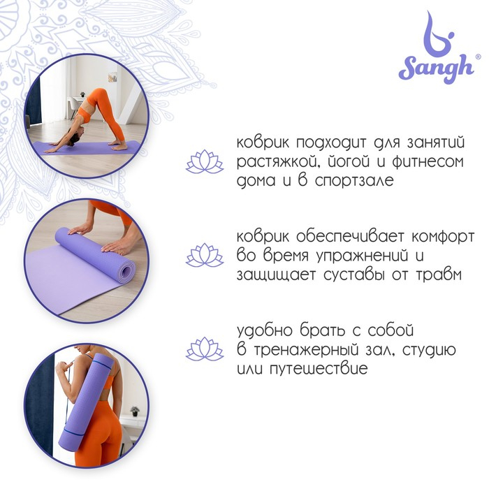 Коврик для йоги Sangh, 183×61×0,6 см, цвет сиреневый