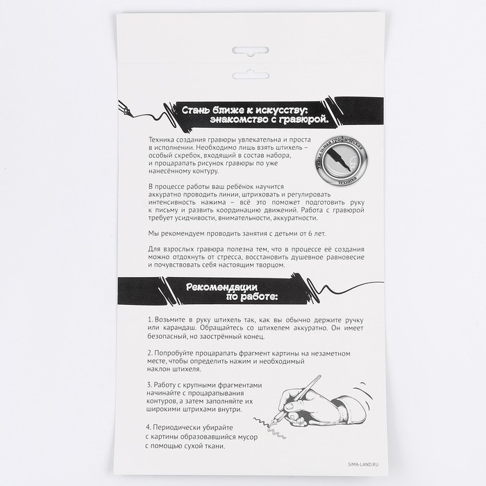 Гравюра представляет собой многослойное панно, покрытое чёрной краской, на которое нанесён контур рисунка. С помощью особого скребка (штихеля), который входит в набор, путём процарапывания и создается гравюра.