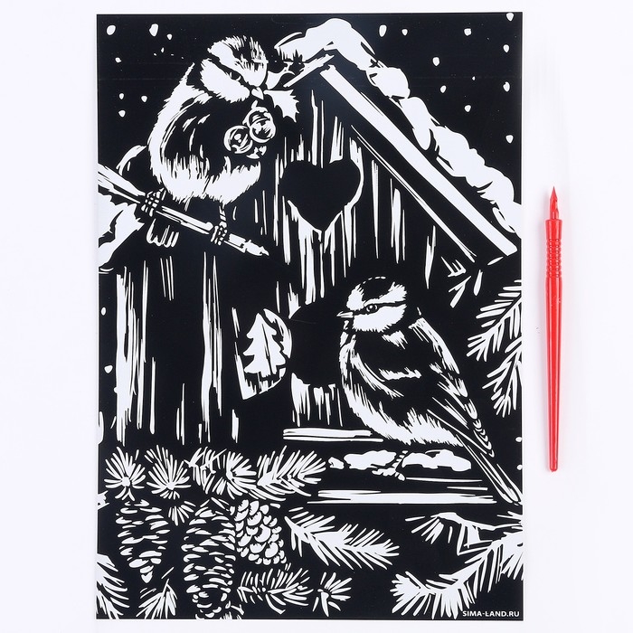 Гравюра на новый год «Птички в скворечнике», с эффектом золото, А4