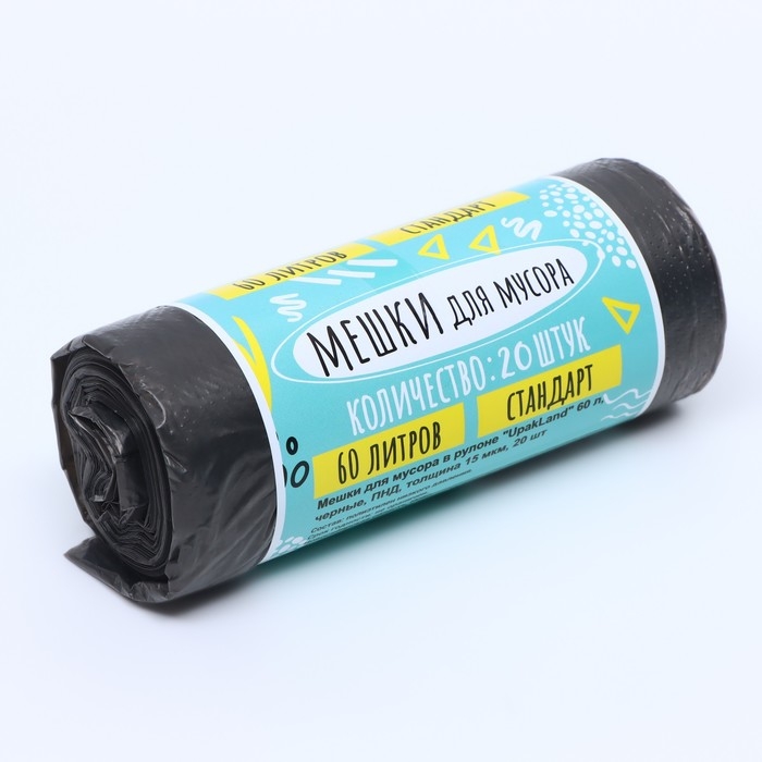 Мешки для мусора в рулоне "UpakLand" 60 л, черные, ПНД, толщина 15 мкм, 20 шт