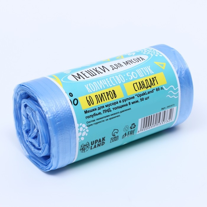 Мешки для мусора в рулоне "UpakLand" 60 л, голубые,ПНД, толщина 8 мкм, 50 шт