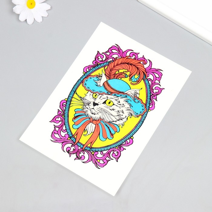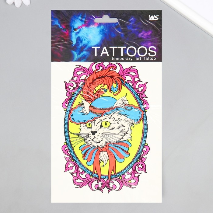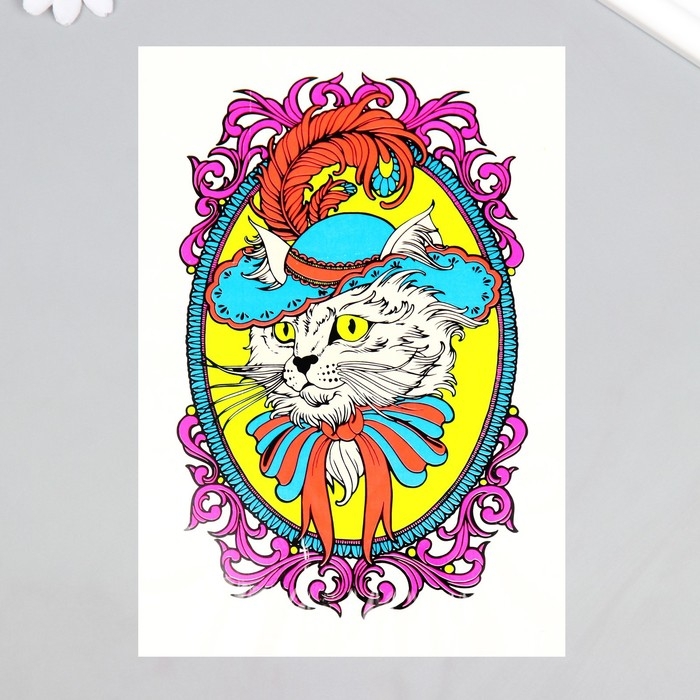Татуировка на тело неон цветная "Кот в шляпе" 26х14,5 см