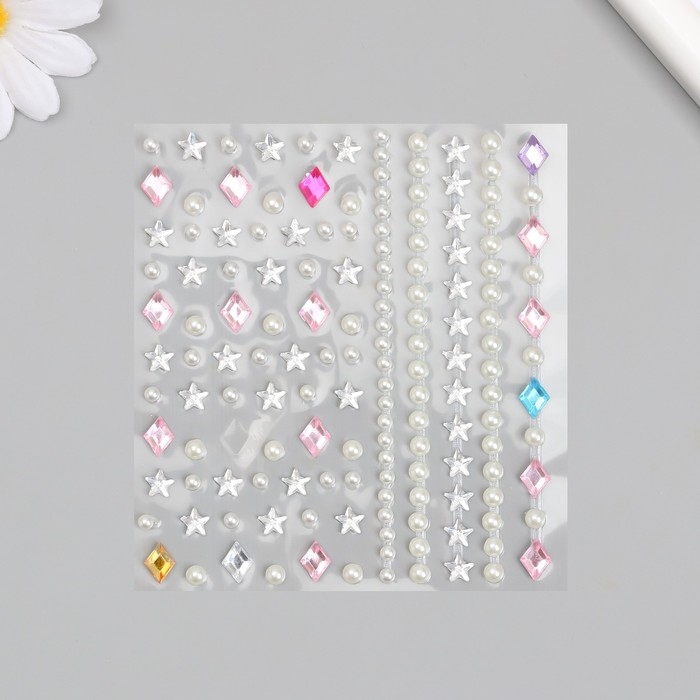 Наклейка пластик стразы, жемчужины "Цветочки, ромбики" 8,5х9,5 см