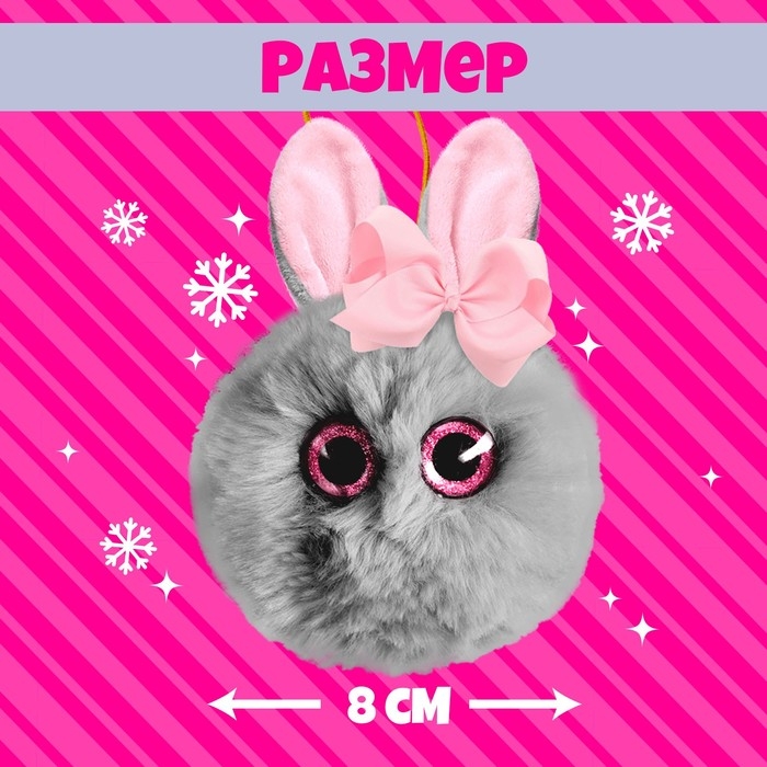 - Диаметр игрушки — 8 см (без учёта длины ушек и хвостика).