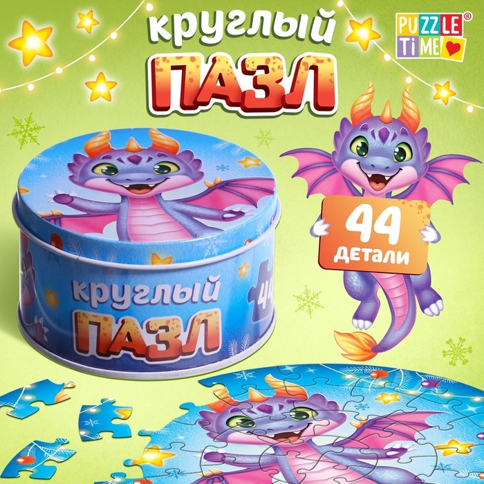 Круглый пазл «Весёлый дракончик», в металлической коробке, 44 детали