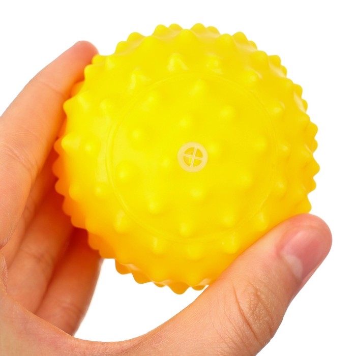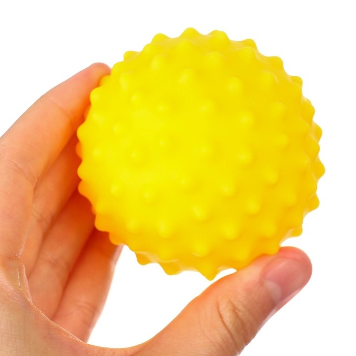 Мячики с рельефной массажной поверхностью способствуют развитию мелкой моторики и тактильных ощущений. Давление на фактурную поверхность мячиков стимулирует и благоприятно воздействует на нервные окончания, ответственные за большинство процессов в организме. Шарики имеют яркие цвета, которые способствуют развитию зрения, а пищалка внутри развивает слуховое восприятие.