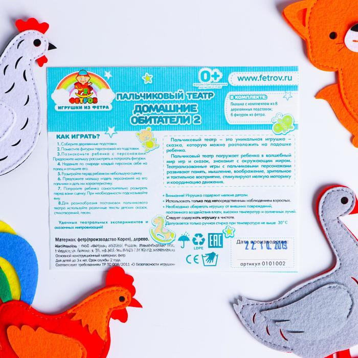 Пальчиковый театр — это игрушка-сказка, которая легко помещается на ладошке. Пальчиковый театр «Домашние обитатели № 2» подарит ребёнку сказочный мир игр, познакомит с замечательными персонажами домашних животных и птиц. В наборе вы найдёте собаку, кошку, кролика, гуся, курицу и петуха. Каждого персонажа можно установить на деревянные подставочки и расставить на столе или надеть на пальчики ребёнка и устроить театральную импровизацию или сюжетную игру.