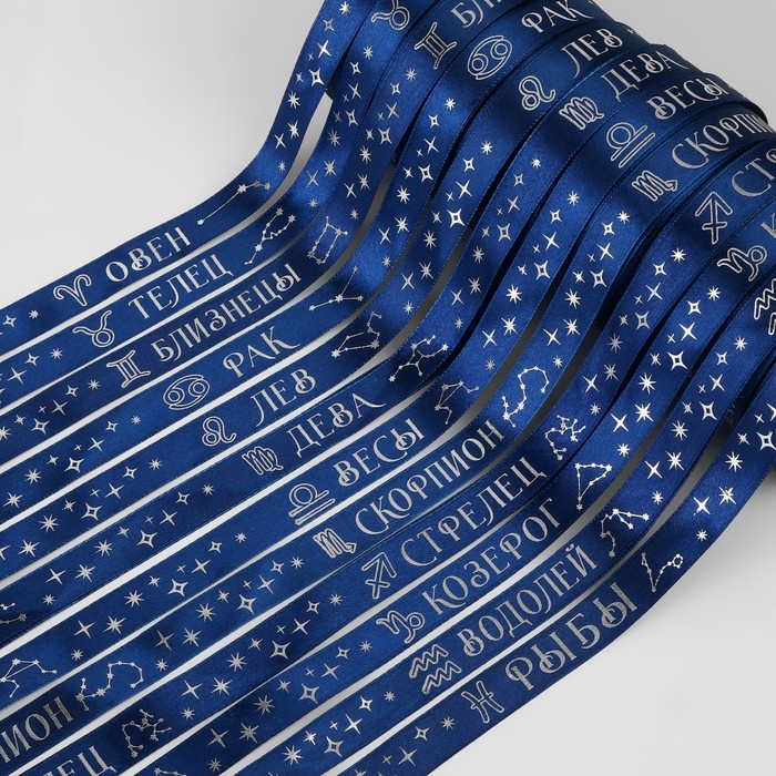 Лента атласная с тиснением «Водолей», 15 мм, 18 ± 1 м, цвет тёмно-синий/серебряный №120
