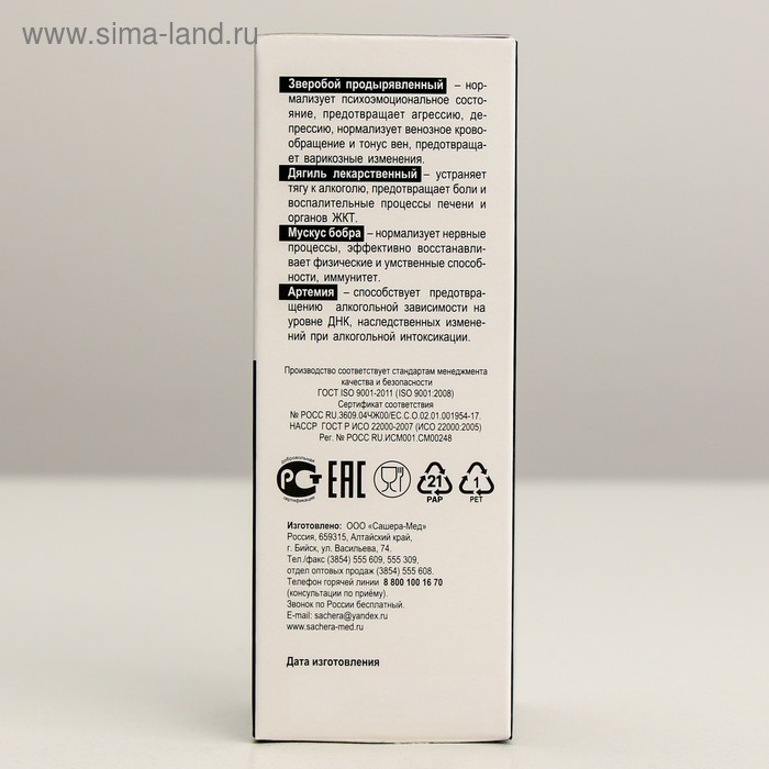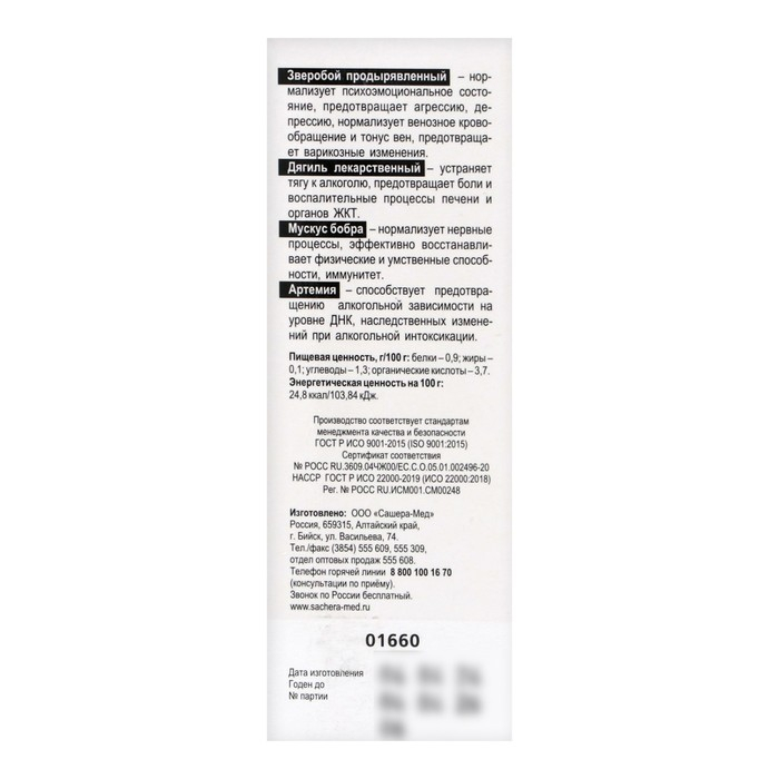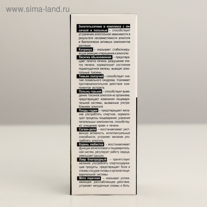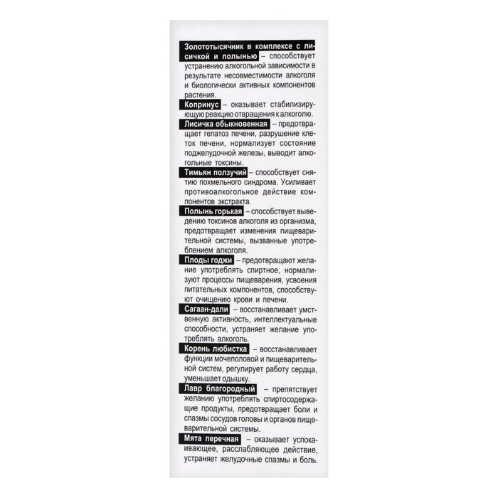Состав: золототысячник, копринус, лисичка обыкновенная, тимьян ползучий, полынь горькая, плоды годжи, сагаан-дали, корень любистка, лавр благородный, зверобой продырявленный, мята перечная, дягиль лекарственный, мускус бобра, артемия.