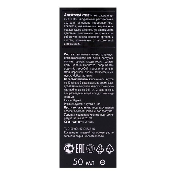 АлкАтекАктив – экстраординарный 100% натуральный растительный экстракт на основе природных компонентов, оказывающих выраженное подавляющее алкогольную зависимость действие. Компоненты экстракта способствуют восстановлению органов и систем, изменённых от алкогольной интоксикации.
