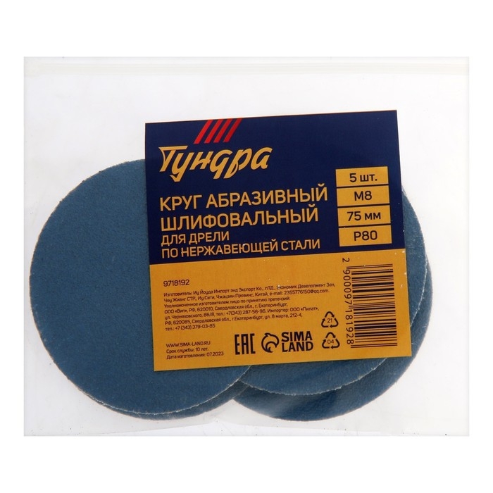 Круг абразивный шлифовальный ТУНДРА, по нержавеющей стали, для дрели, М8, 75 мм, P80, 5 шт. 971819