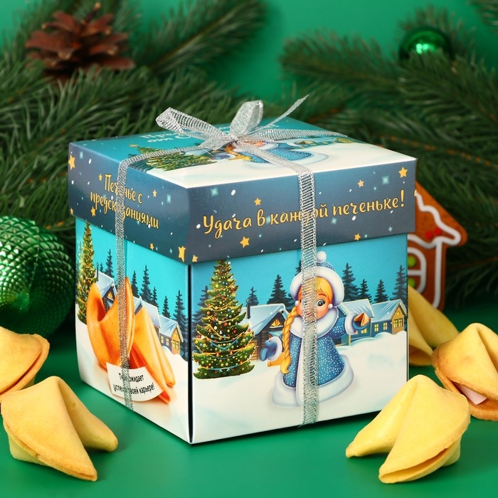 Несмотря на то, что печенье - вкусный десерт, это контейнер предсказания. За это его и любят. 5 штук печенья упакованы в оригинальную коробочку. Внутри каждого печенья - текст, который заставит вас улыбнуться, подумать, помыслить, счесть случайность закономерностью, и даже поверить в чудо!