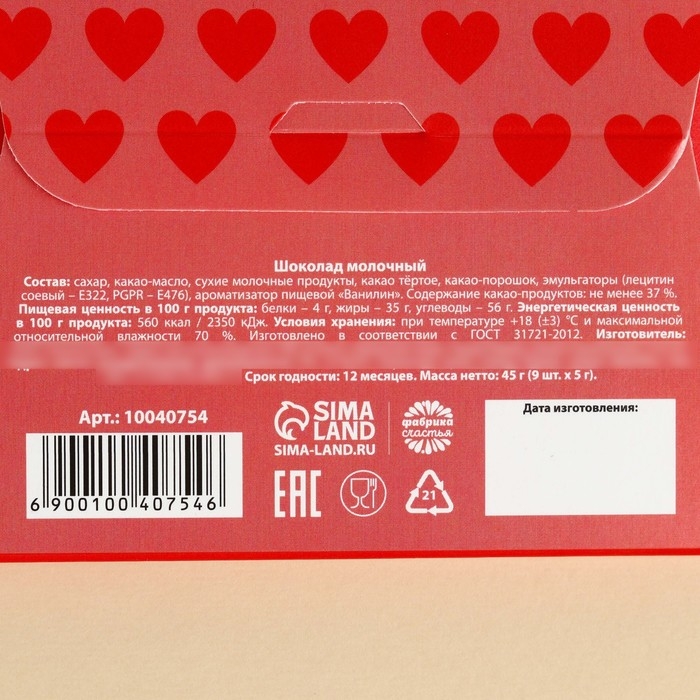 Шоколад молочный «9 причин почему я люблю тебя», 45 г (9 шт х 5 г).