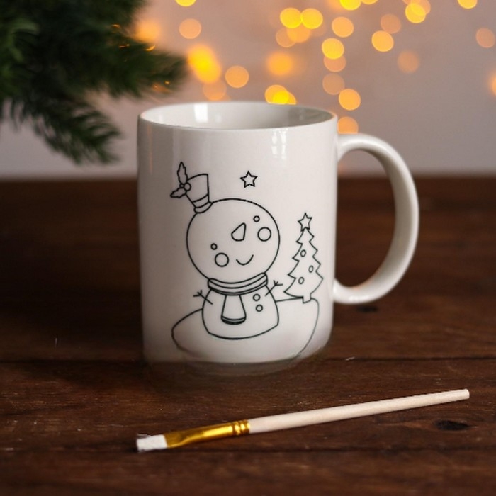 Новый год! Кружка под раскраску «Снеговик с ёлочкой», кисть