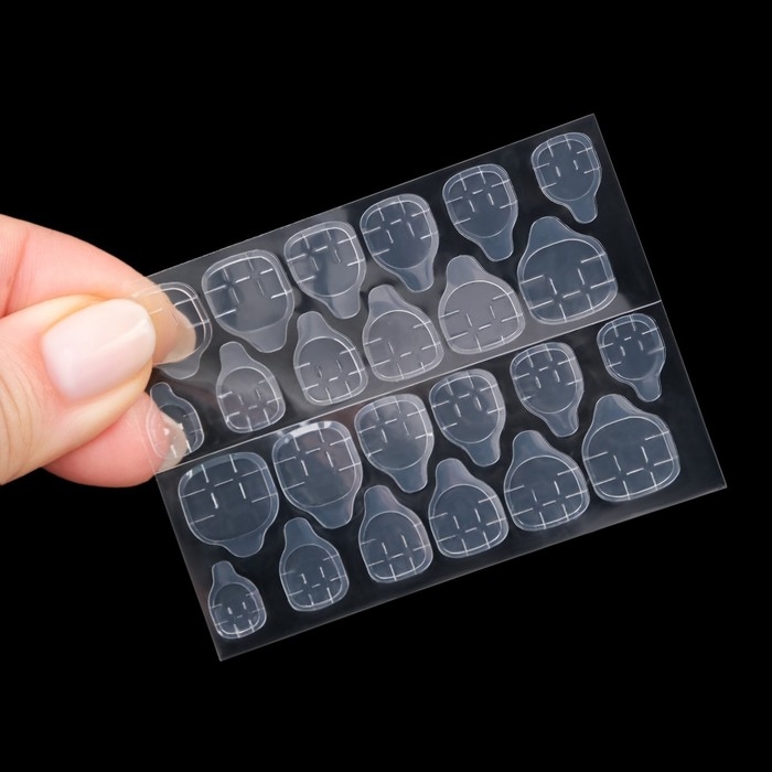 В наборе с накладными ногтями идут клеевые пластины. За счёт этого уменьшается вероятность механического травмирования природного ногтя. Клеевые пластины безопасны в применении и не вредят натуральным ногтям, в отличие от клея. Клей содержит составе высокую токсичность, что может сказаться на вашем организме.