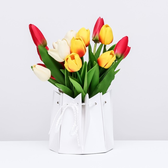 - Букет в такой упаковке сохраняет вертикальное положение, поэтому его удобно устроить в салоне автомобиля, а в помещении он может стоять на столе без вазы.