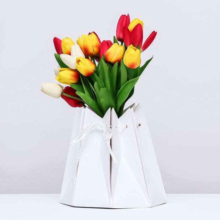 - Букет в такой упаковке сохраняет вертикальное положение, поэтому его удобно устроить в салоне автомобиля, а в помещении он может стоять на столе без вазы.