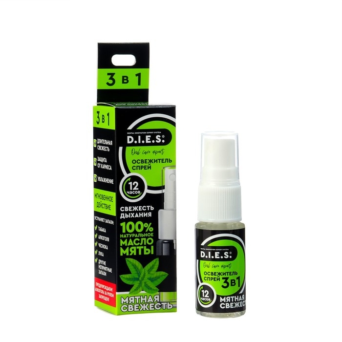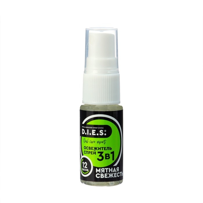 Освежитель для рта D.I.E.S. мятный 3 в 1 - это эффективное средство для освежения дыхания, устранения неприятного запаха и защиты от кариеса.