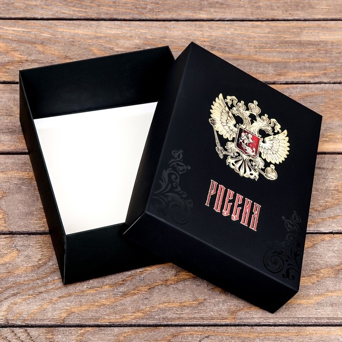 Воплощение патриотизма в каждой детали! Наша подарочная коробка с надписью Россия украшенная золотым тиснением, тач-покрытием и величественным гербом создана для тех, кто ценит историю и красоту. Обрамленная национальными символами, эта коробка станет идеальным обертыванием для ваших подарков, привнося в них шарм и гордость за Родину.